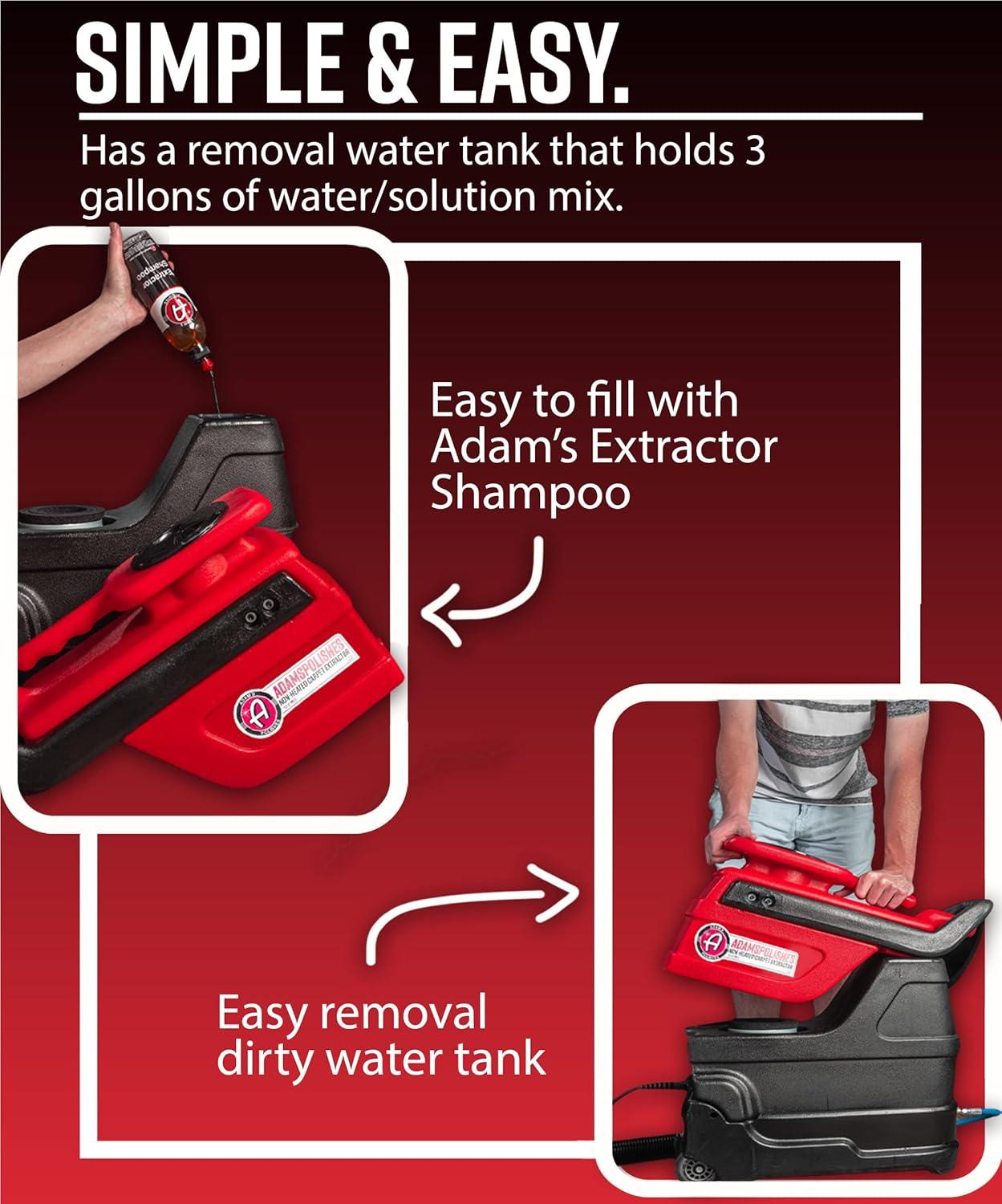 ✅ 3 Gallon Tank Capacity – Holds up to 3 gallons of water mixed with Adam's Extractor Shampoo. Plenty of capacity for big jobs in your car, automobile, boat or RV. Powerfully dispenses water/solution mix to go deep into your automobile's surfaces and eliminate spots and dirt.