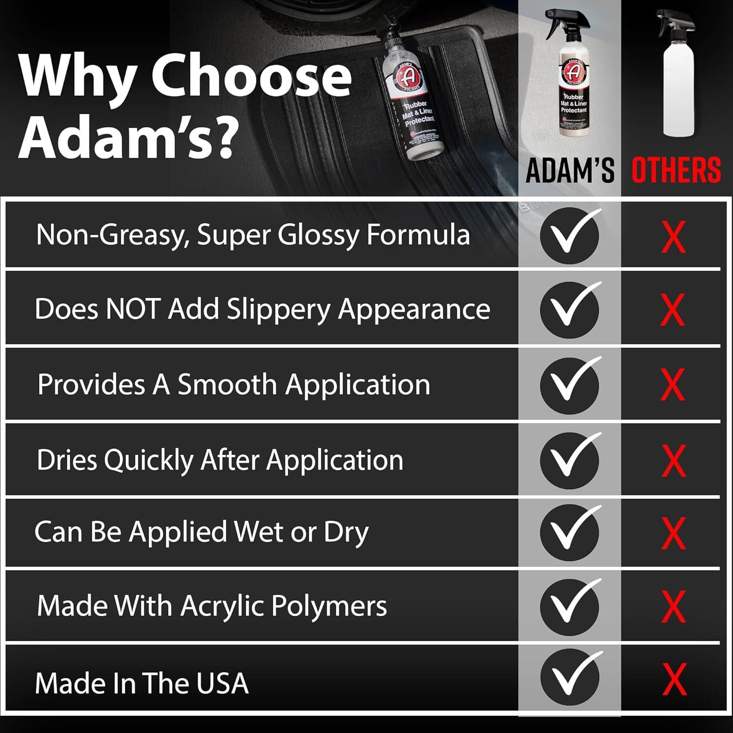 ✅ PAIRS WITH ADAM'S RUBBER MAT & LINER CLEANER – Maximize the efficacy of Adam's Rubber Mat & Liner Protectant by using it in conjunction with Adam's Rubber Mat & Liner Cleaner. This perfect pairing ensures a comprehensive cleaning and protection regimen for your floor mats and liners. The protectant's formulation is specifically designed to complement the cleaner, enhancing its protective capabilities for a thorough maintenance routine.